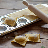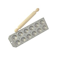 En form för att tillaga dina alldeles egna färska agnolotti hemma! Det är relativt enkelt att tillaga dina egna fyllda agnolotti hemma. Med denna form i aluminium gör du 12 agnolotti på en gång. Du lägger helt enkelt pastadegen över den mjölade formen, tillsätter fyllning i de små håligheterna och förseglar med ett extra lagar pastadeg. Använd den medföljande kaveln för att pressa ihop och separera hålen så att du får 12 fina färdiga agnolotti. I paketet ingår en gjuten form i aluminium samt en kavel i trä. OBS! Handdiskas. Storlek på färdiga agnolotti 50x50mm.