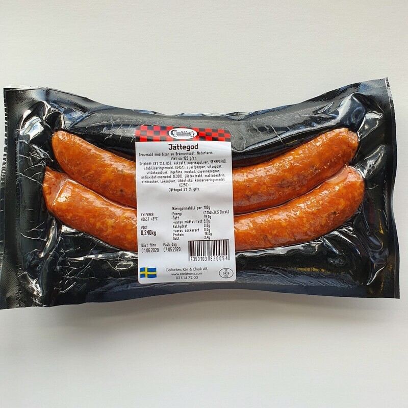 När Carlströms testade denna ostfyllda korv på sina kunder blev reaktionen: Jättegod! Korven fick därmed heta just det. Denna grovmalda korv är smaksatt med hela bitar av brännsvinsost som smälter vid tillagning. Rökt med alspån och stoppad i naturtarm. Jättegod! att grilla eller steka. I paketet ingår 2st korvar.