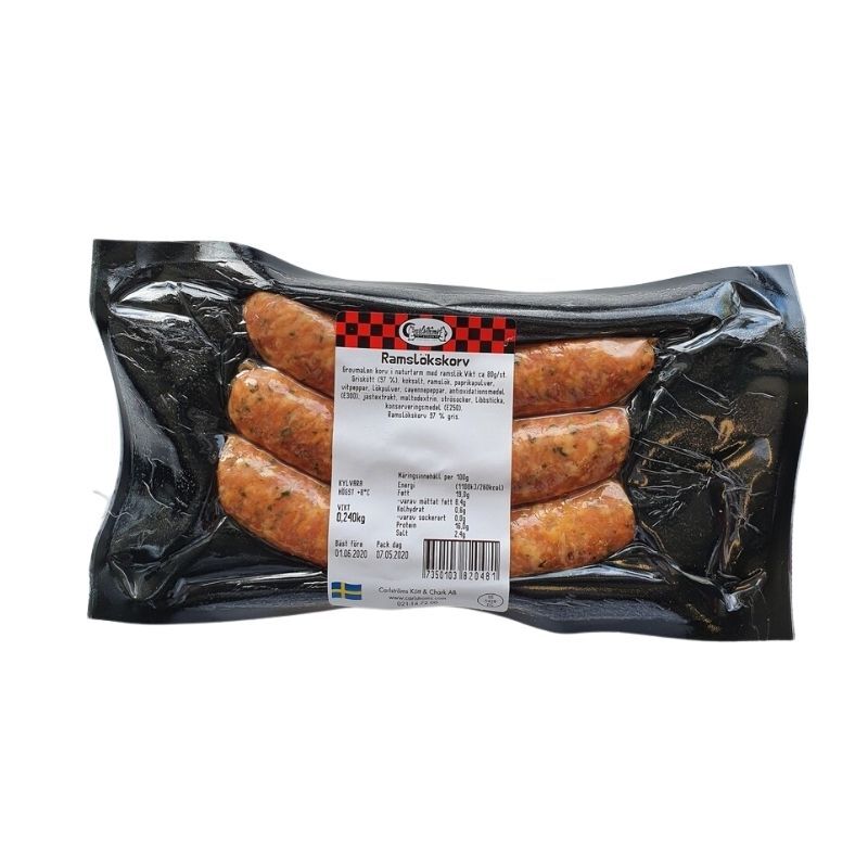 En grovmald korv i naturtarm som kryddats med ramslök som ger korven en mild smak av vitlök. Korven är rökt med alspån och passar utmärkt att både grilla och steka. Innehåller 3st korvar.