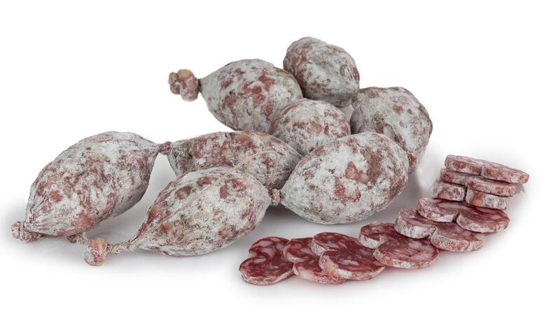Bocconcini är en underbar liten lufttorkad salami från Emiglia Romagna som smaksatts med vin, kryddor och vitpeppar. En ganska mild salami med lite sötare toner som lufttorkas i ett pärlband av flera små salamibollar. Säljs i paket om tre stycken "salamipärlor" på ca 140g totalt.