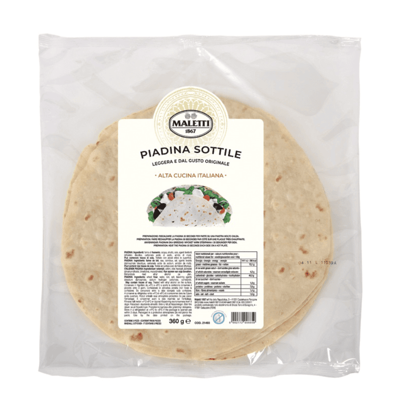 Den ursprungsmärkta 'Piadina Romagnola IGP alla Riminese' är drottningen av det klassiska bakverk som finns i lite olika varianter i Italien. Underbar italiensk streetfood där du själv bestämmer om innehållet ska bestå av ost, charkuterier, grönsaker eller en härlig blandning. Innehåller 3st bröd.