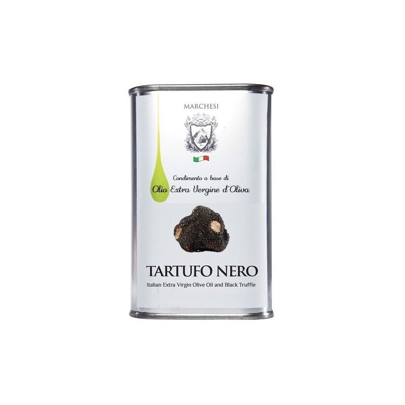 En extra jungfru olivolja från producenten Marchesi utanför Rom som smaksatts med svart vintertryffel. Den här jungfruoljan har en mild smak av tryffel och passar utmärkt till olika smårätter (antipasti) eller som smaksättare i såser.
