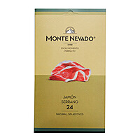 Från grisar av keltiskt ursprung, uppfödda i Spanien och utvalda för deras storlek, ålder och fettmarmorering. Från en av Spaniens topproducenter Monte Nevado som finns på högslätterna nordväst om Madrid i Castilla y León. Den är saltad och lufttorkad i minst 24 månader och därefter urbenad. En fantastisk serrano helt utan tillsatser och med en kraftig och ren smak. Lufttorkad i minst 24 månader. 6 skivor. Serveras rumstempererad för att ge mer smak!