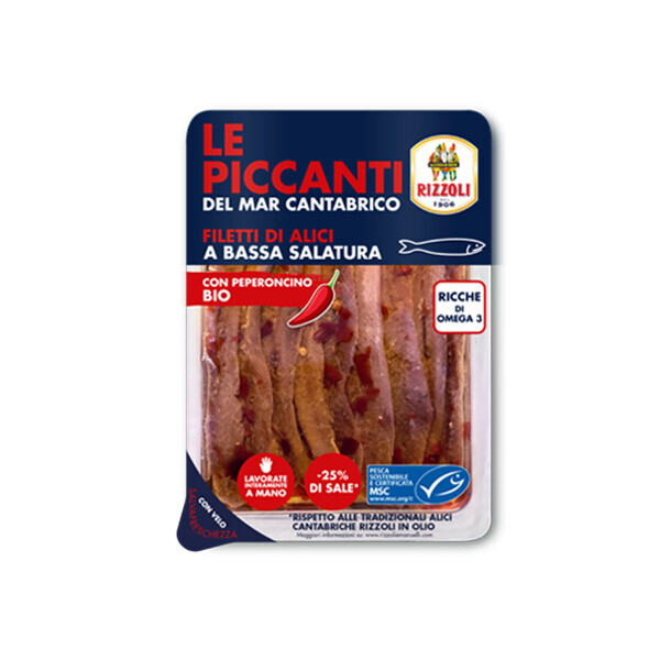 Hela sardellfiléer (MSC) inlagda i olja och peperoncini - en underbar antipasti på en bit rustikt bröd! Dessa fantastiskt goda sardeller smaksatta med peperoncini är fantastiska att äta som de är och en oumbärlig ingrediens i en mängd klassiska italienska rätter.
