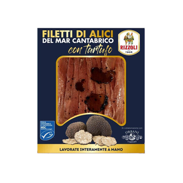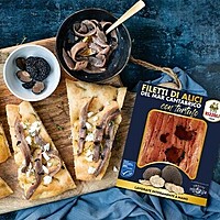 Hela sardellfiléer (MSC) inlagda i ekologisk olja och sommartryffel - en riktigt lyxig antipasti på en bit varmt italienskt lantbröd! Dessa fantastiskt goda sardeller smaksatta med skivor av sommartryffel är fantastiska att äta som de är - det bästa från havet & skogen.
