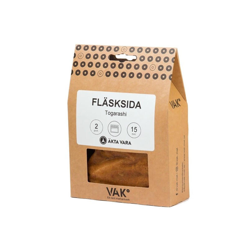 Fläsksida – Togarashi från VAK° är ett kocklagat, tillsatsfritt, mathantverk färdigt att värma i ugnen. Perfekt mörhet, med japanska smaker som sesam och yuzu. Servera gärna med klyftpotatis eller kanske med en italiensk nudelpasta. Beräknat till två portioner.