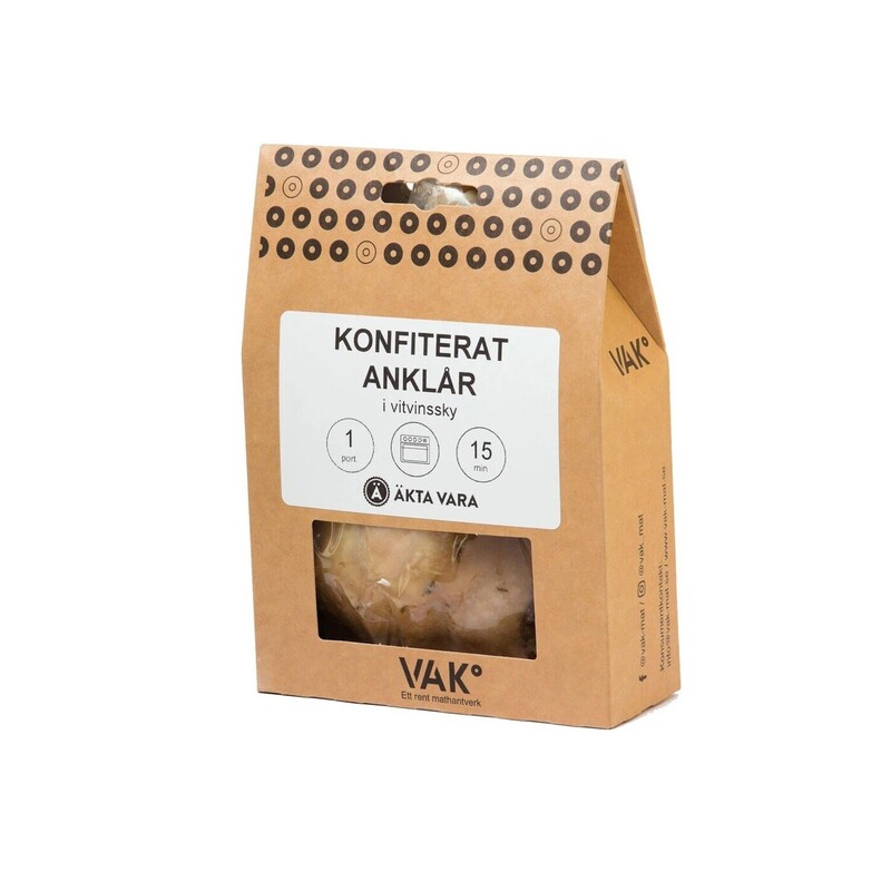 Konfiterat anklår från VAK° är ett kocklagat, tillsatsfritt, mathantverk färdigt att värma i ugnen. Fransk klassiker som sous vide-lagats med ankfett, vitt vin och örter, vilket ger ett mjällt anklår och en magisk sky. Passar perfekt med en krämig risotto eller din din favoritspasta från Granoro. Beräknat till en portion.