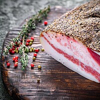 Guanciale är en variant av lufttorkad bacon som ursprungligen kommer från de centrala regionerna som Lazio och Umbrien, men produceras egentligen över hela Italien. Villani gör naturligtvis sin alldeles egna regionala variant med klassiska örter från Emiglia Romagna! Guancia betyder "kind" på italienska och guanciale är just lufttorkad griskind som har kryddats med örter, salt och peppar. En oumbärlig ingrediens i rätterna Carbonara och Amatriciana.